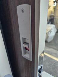 先日の戸建てPS2ロックはエルムーブという玄関引き戸で、戸先錠ケースなしの部材を見つけて手配しました。下側のサムターンには鍵穴があり、これがセキュリティサムターンの役割をしています。勝手口ドアはユーシンWNシリンダー2ロックで交換し、この戸建現場は完了です。